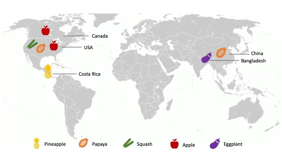 The global fruit & vegetable seeds market size is estimated at USD 9.8 billion in 2020 and is expected to grow at a CAGR of 8.2% in the forecast period 2021 until 2025. But what will be the contribution of gene edited and genetically modified crops driving this growth? As we enter a new decade, where new technologies such as gene editing are brought to the market, I believe it is important to look back and learn from the past, including successful and less successful introductions of genetically modified vegetable and fruits. The map above shows where currently biotech vegetables and fruits are produced.